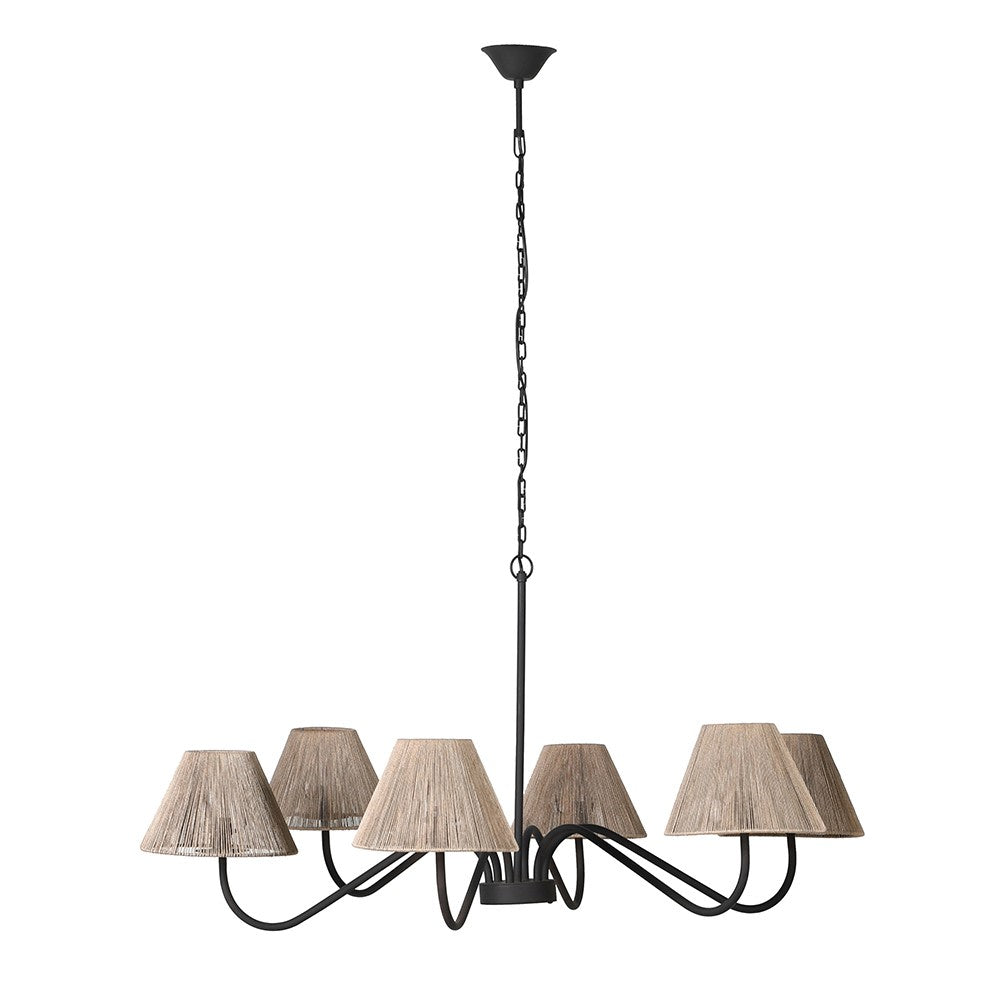 The Isobella chandelier is inspired by traditional interiors, six hand-knotted raffia shades are carefully wrapped around a matte, blackened brass plated frame at varying heights to create a standout effect.