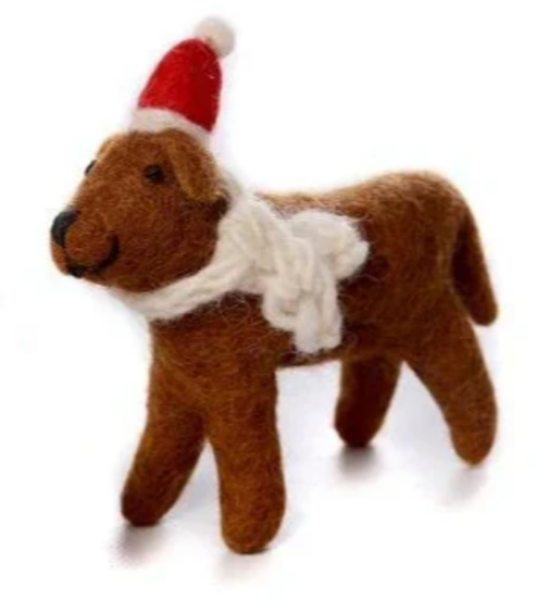 A lovely Chocolate Labrador comes with his Christmas hat and knitted scarf, plus a hanging loop ready to go on the tree.