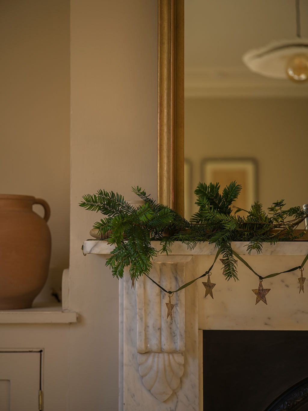 This festive garland features antique brass-finished stars strung along a green velvet ribbon. The softly aged metal adds warmth and texture to seasonal displays, with a subtle shine that pairs beautifully with foliage or candlelight.