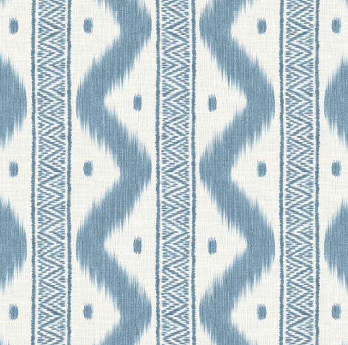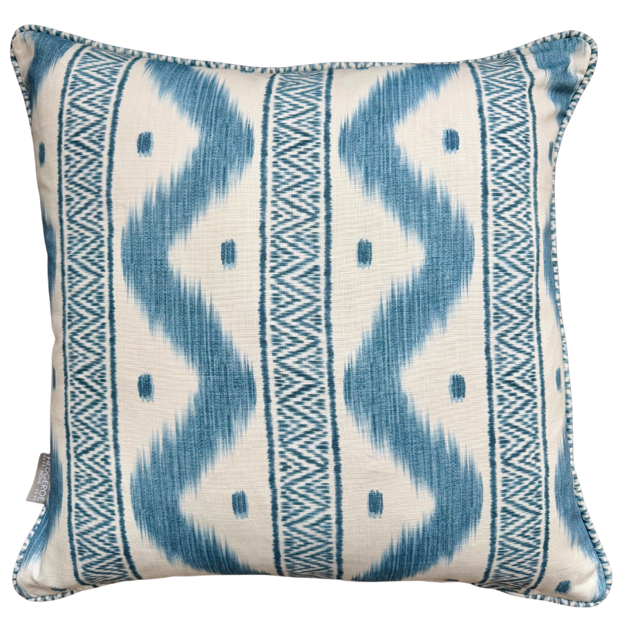 Showcasing an understated ikat-inspired pattern, this sky blue cushion combines a refined ogee stripe with delicately curved decorative flourishes. Supplied with filler included, it's ready for immediate use in any room.